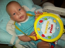 Дениске подарили барабан, но пока он не стучит по нему палочками, а только грызет ремни)
