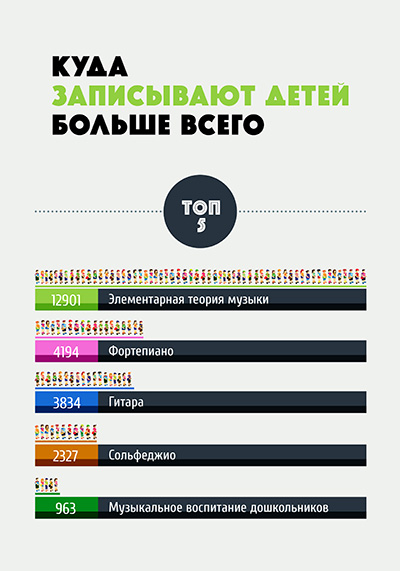 В первой тройке по числу поданных заявлений расположились фортепиано (4200), гитара (3800) и сольфеджио (2300). В ТОП-5 при этом не попали пение, на которое записались всего 700 человек, и скрипка (163). Духовые и ударные инструменты, духовой оркестр не попали даже в первую десятку.