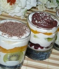 К творогу добавить сметану и сахар.Творожную массу взбить блендером.Фрукты очистить и порезать кружочками, а потом пополам, можно на четыре части.Желатин залить100 мл.молока и дать время набухнуть.Поставить желатин на огонь и прогреть до полного растворения(не кипятить). Влить в творожную смесь и хорошо перемешать.В форму выложить слой фруктов.Залить творожной массой и снова выложить слой фруктов.Так повторять столько, сколько необходимо. Последним в десерте творожном должен быть слой с творожной массой. Украсить шоколадной стружкой или лёгким кремом.Десерт творожный поставить в холодильник на полчаса охлаждаться.