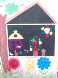 вариант2. Домик из ковролина. Берем большой кусок ковролина, к нему присоединяем различные предметы (героев сказок, собираем урожай овощей и фруктов и т.д.) Все предметы должны присоединяться и разъединяться с использованием липучки.