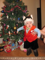 Яромир, 6 месяцев Это первый Новый Год нашего сынишки, мы нарядили его в костюм Кота в Сапогах, но вот самих сапог у нас не было, так как сын еще не ходит, поэтому у нас получился Кот в Валенках))) очень по-русски! |