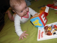Полиночка,добирается до своей любимой книжки))
