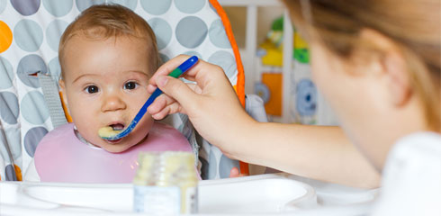 Прикорм давайте не из бутылочки, а с чайной ложки. Осторожно кладите еду на середину язычка, тогда ребенок легко ее проглотит. Во время кормления располагайте ребенка только вертикально. А еще лучше, если он будет сидеть в специальном детском стульчике.
