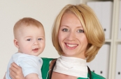 Держите малыша в полувертикальном положении у себя на руках. Поддерживайте ребенка так, чтобы его голова находилась на одной прямой линии с туловищем.
