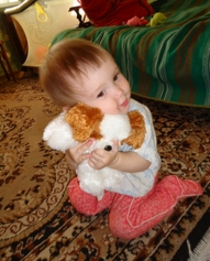 Екатерина, 1 год Катя очень любит свою собачку, она ей поет песенки. |