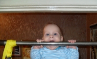 Артём, 7 месяцев Артемка уже собирался спать, но вдруг вспомнил, что еще турник не облизал. И решил по подтягиваться. |